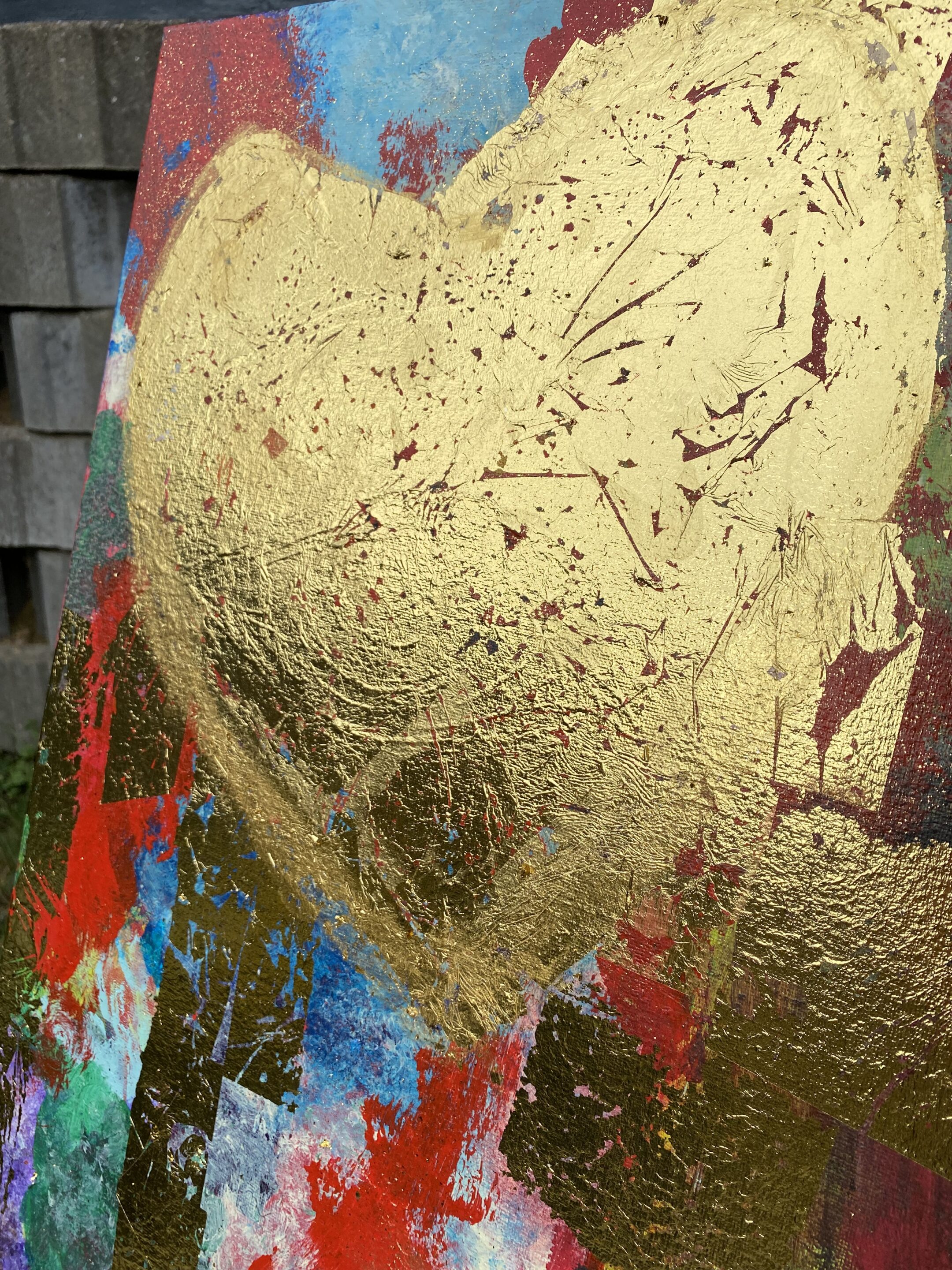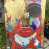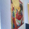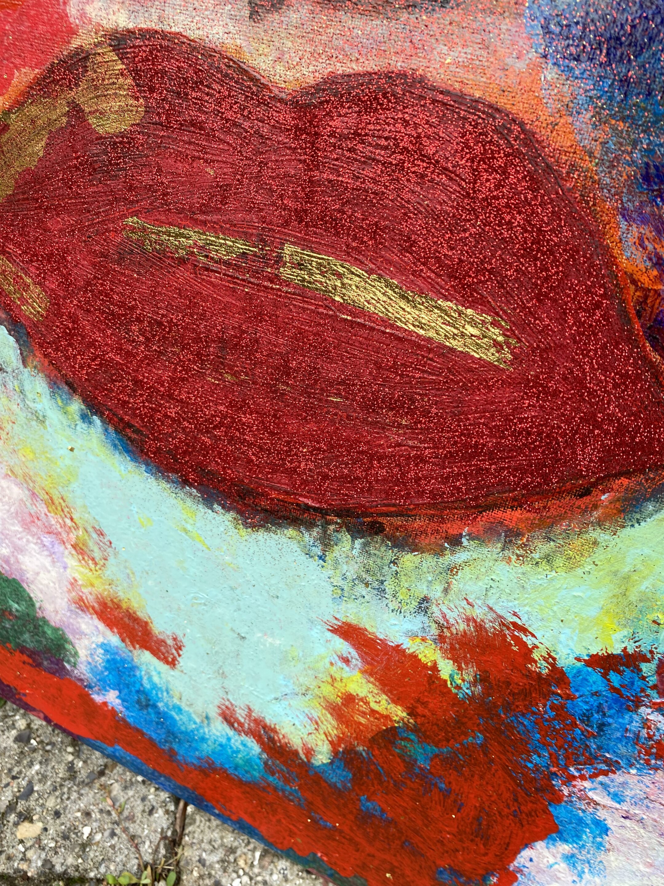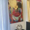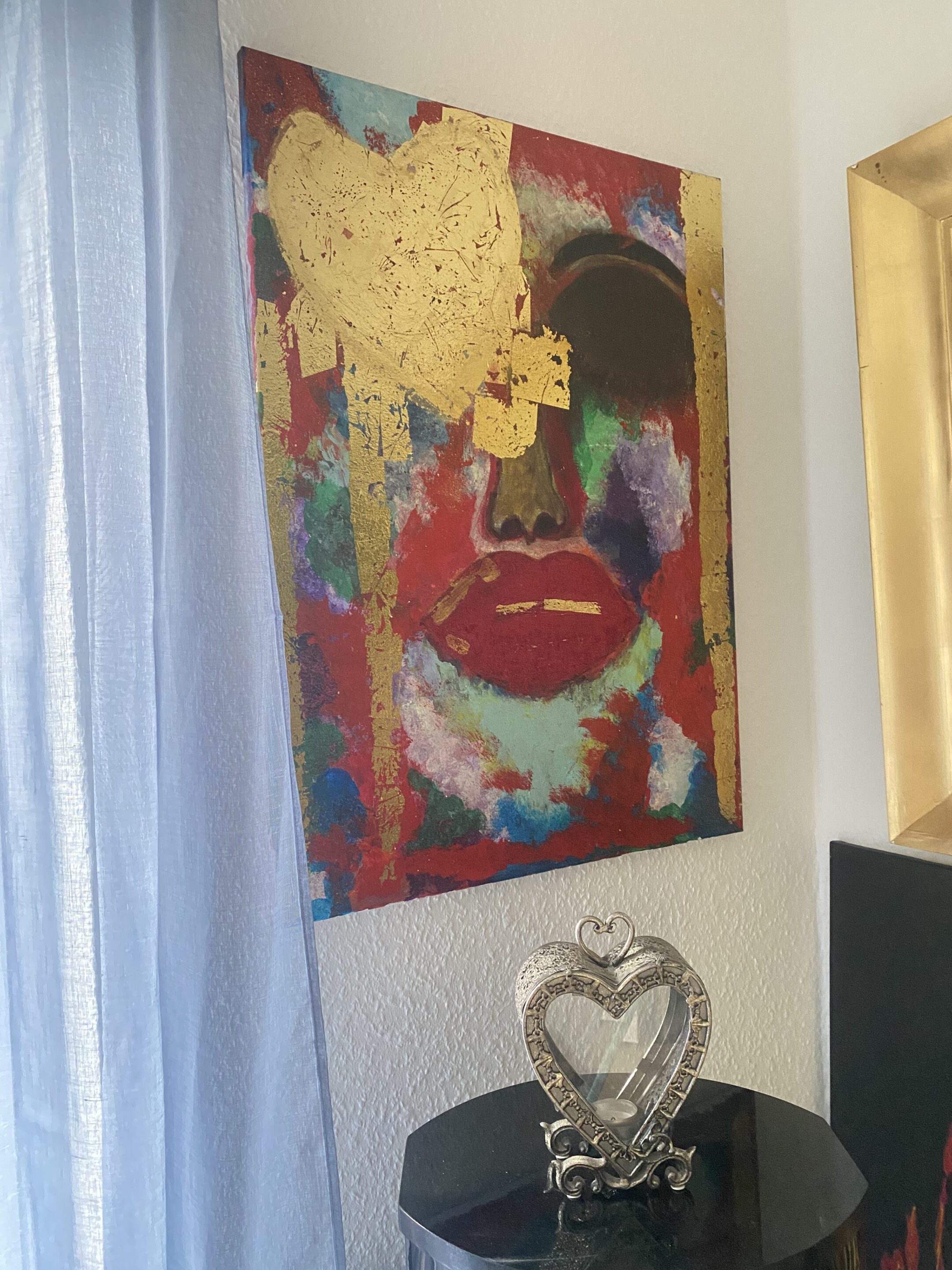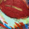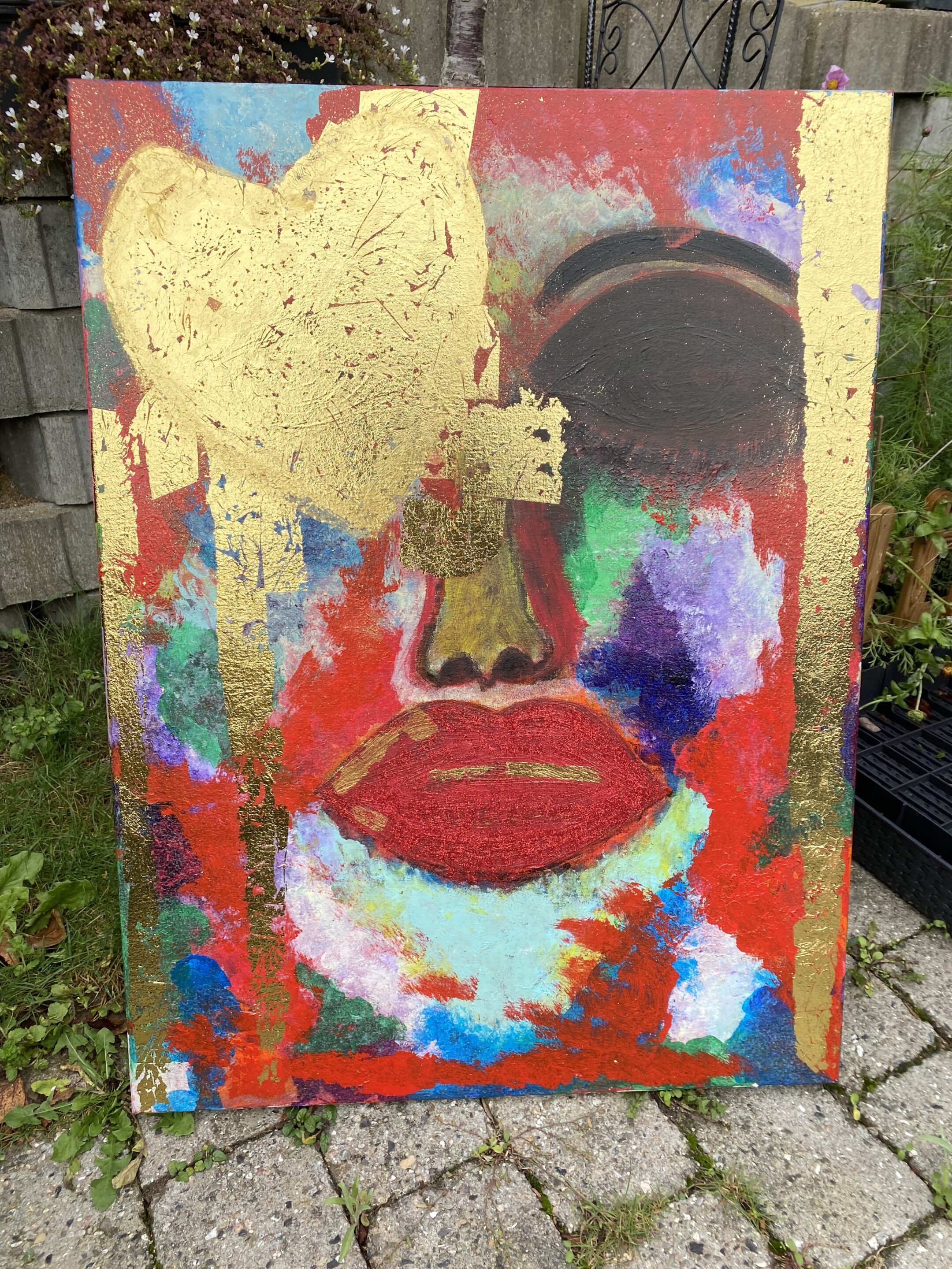 Dette abstrakte maleri viser et farverigt ansigt med fremtrædende røde læber og guld detaljer. Maleriet er lavet på lærred og har en vertikal rektangulær form. Det kan bruges som vægdekoration i bolig- eller kontormiljøer for at tilføre farve og kunstnerisk udtryk. 80×60 cm