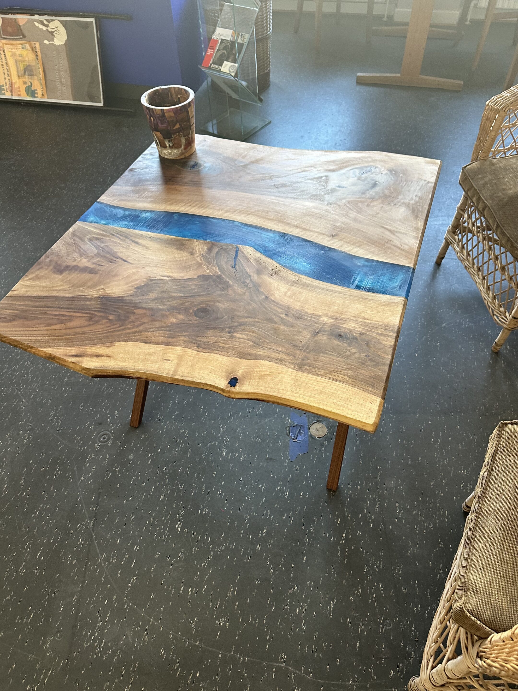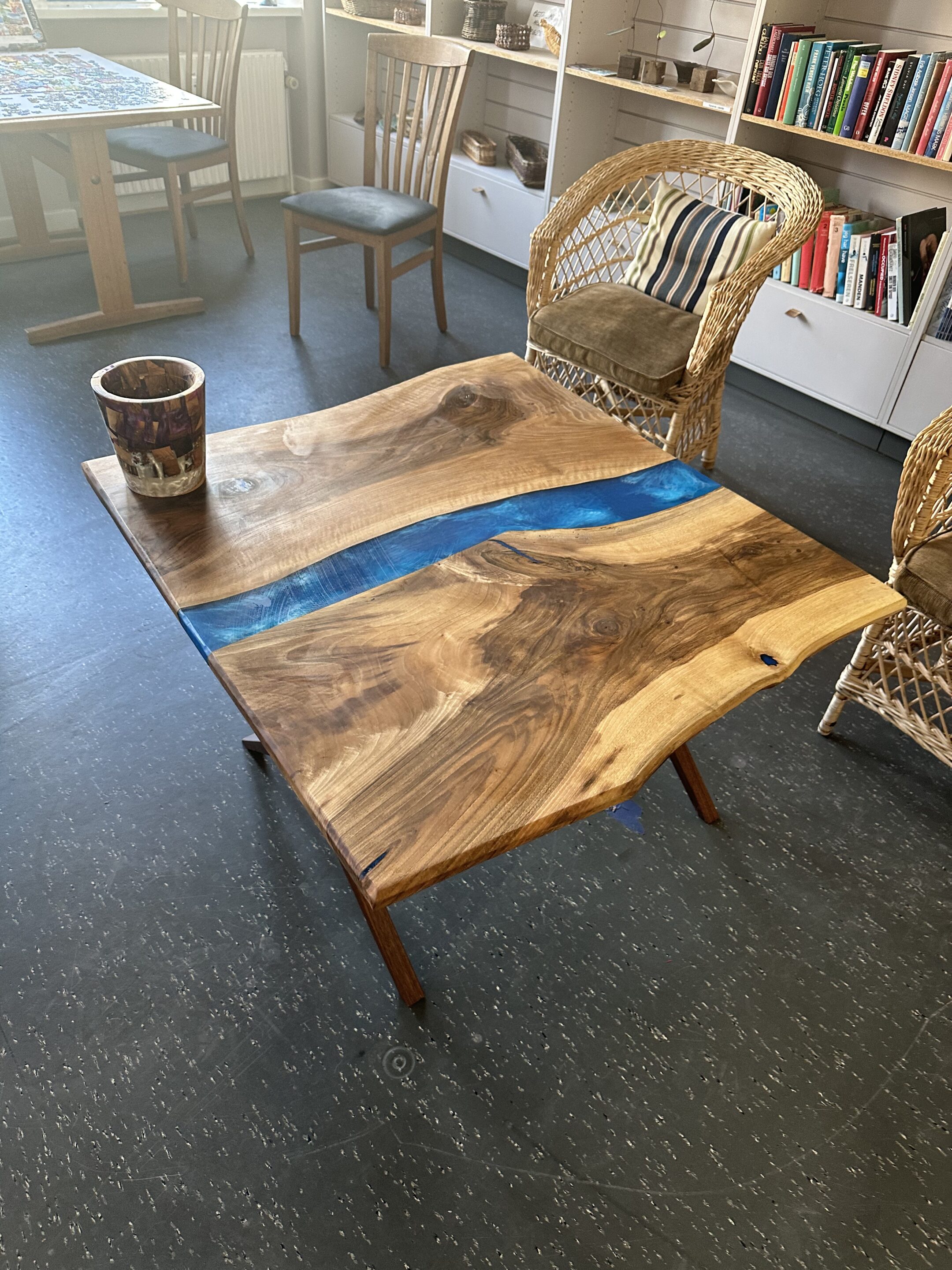 Et eksklusivt og håndlavet flodbord, udført i massivt valnøddetræ med smuk blå epoxy og elegante messingdetaljer.