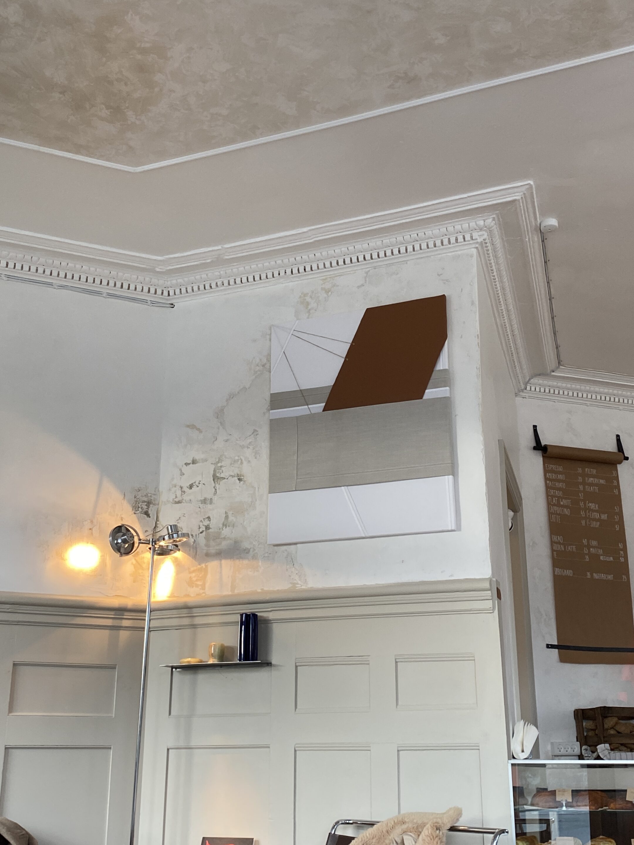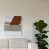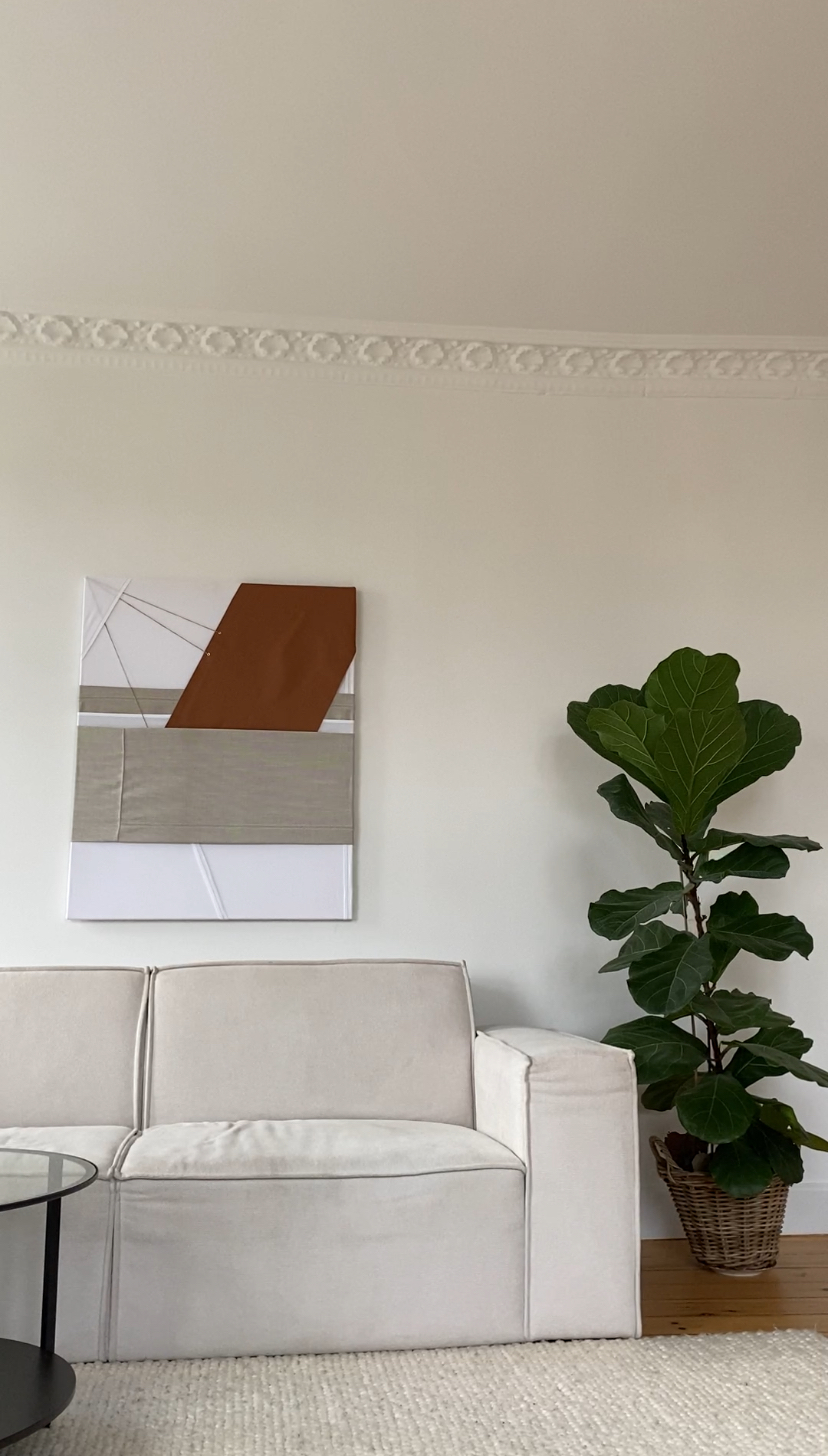 Tekstilværket er fra ReFrame, og er produceret af virksomheders overskudstekstiler. Ved køb at dette værk, bidrager man derfor til den grønne omstilling! Tekstilerne på værket havde før funktionerne sofabetræk, dug og stofprøve.