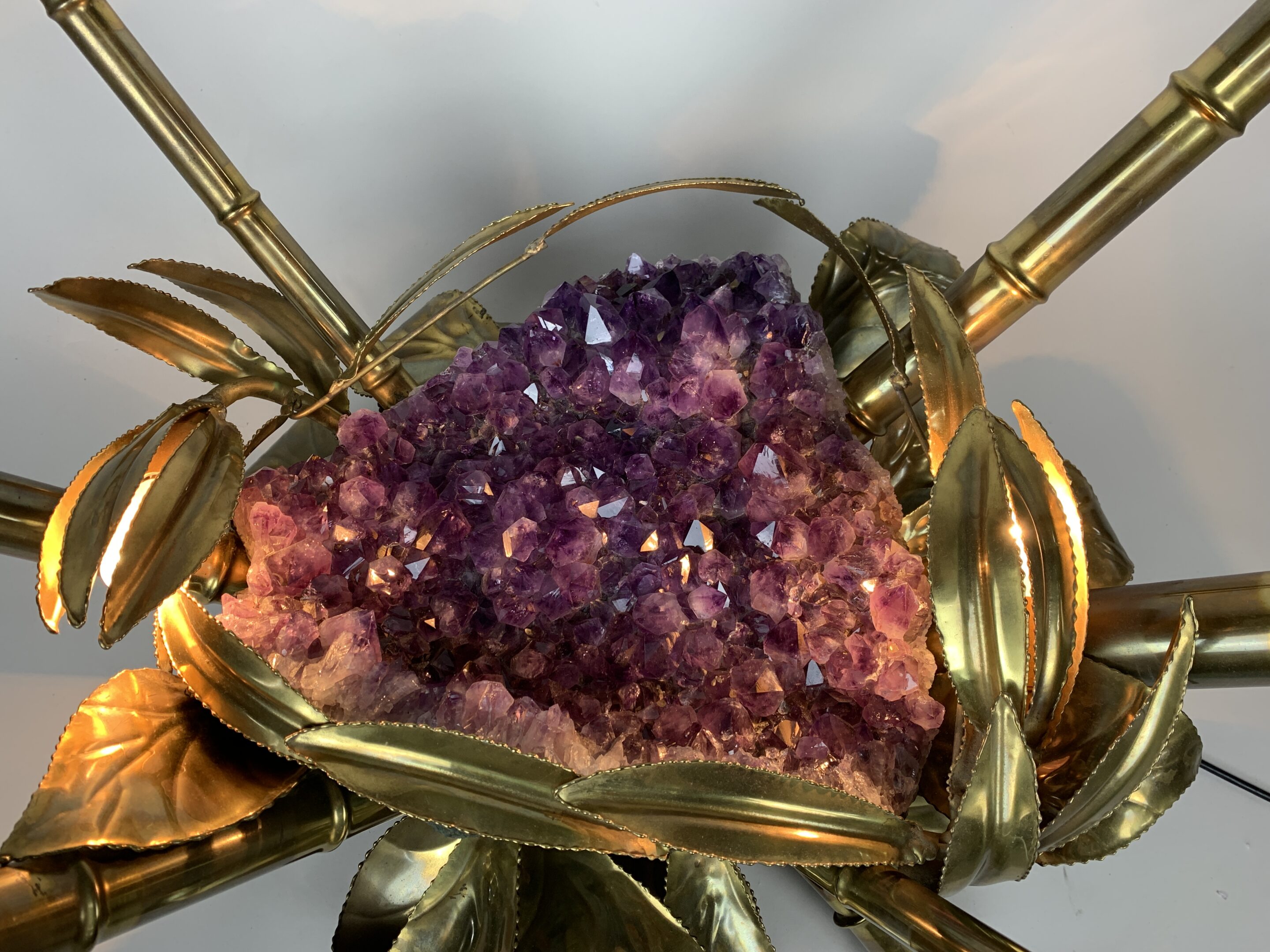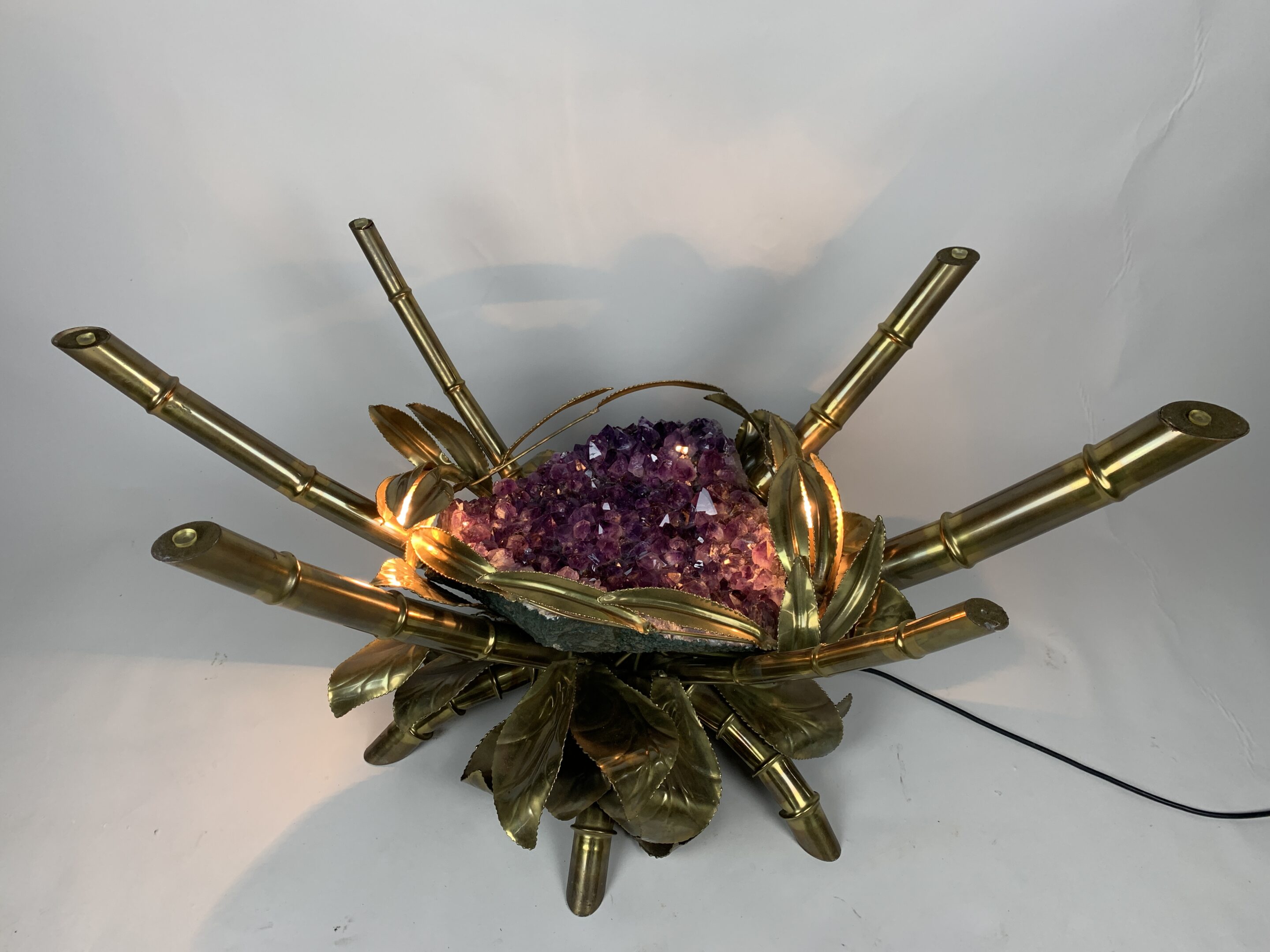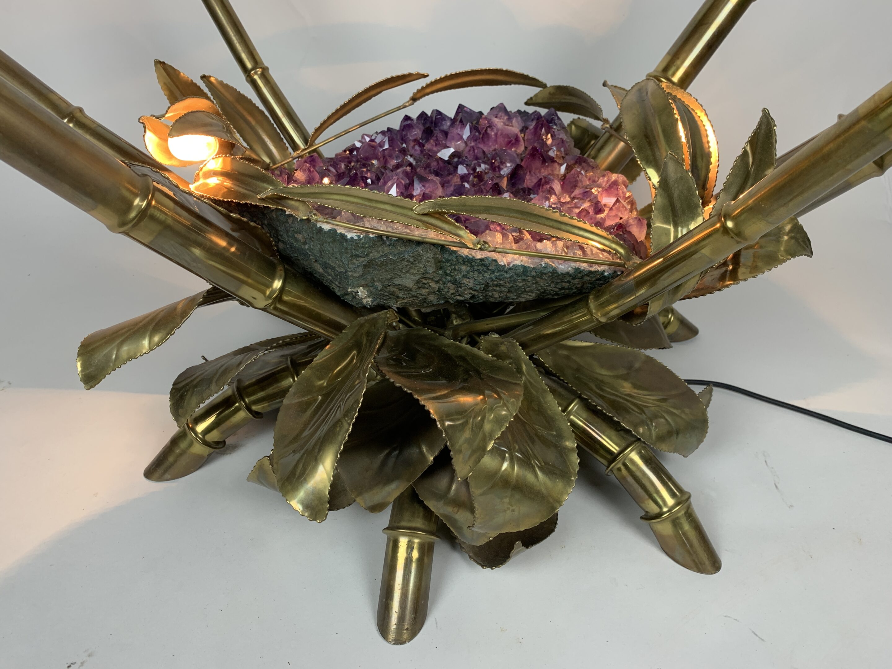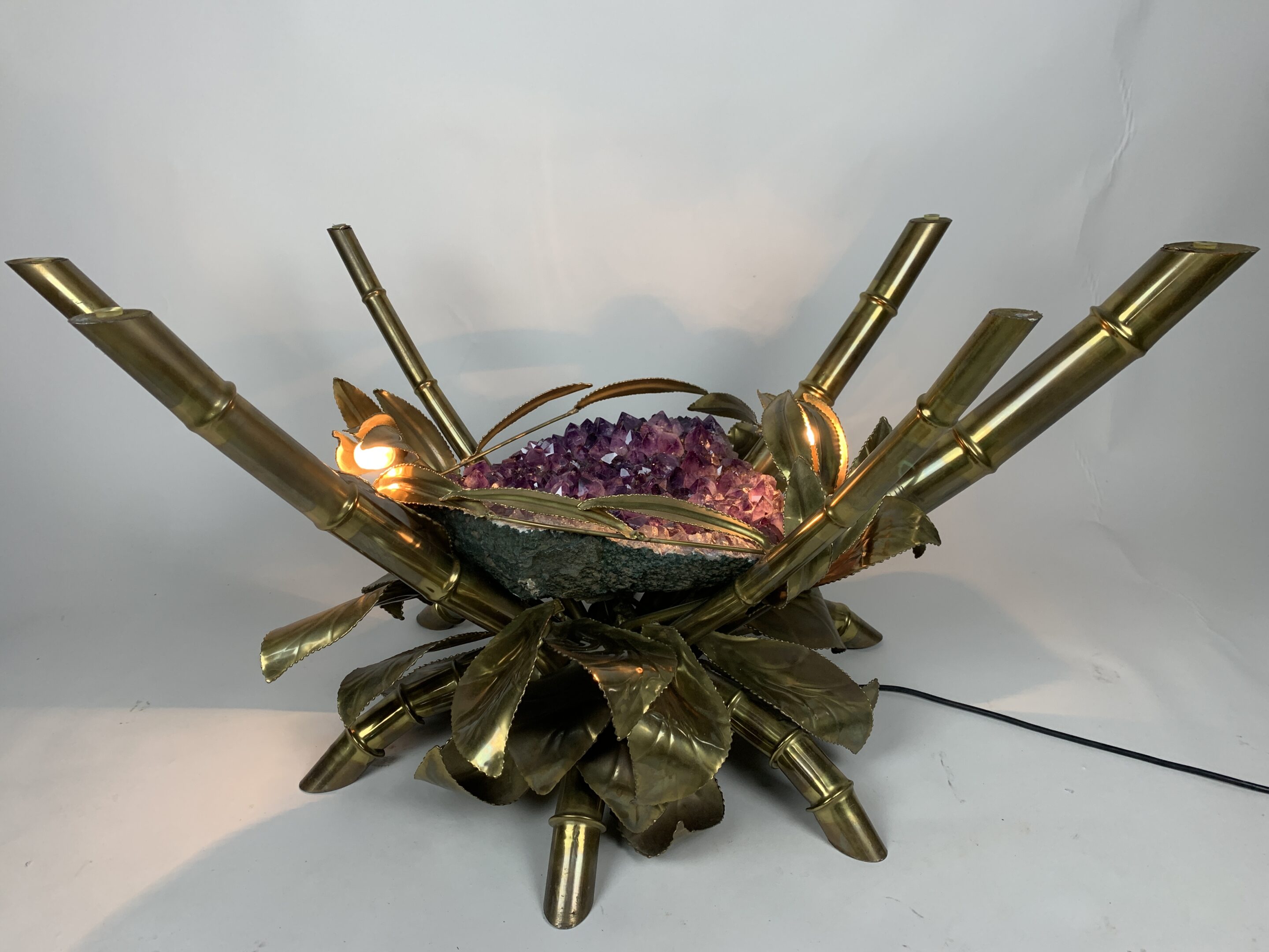 Fransk sofabord i Mid-Century Modern-stil fra Maison Jansen, 1970’erne. Udstyret med en stor ametyststen og messingdetaljer. I meget god stand, dog mangler glaspladen.