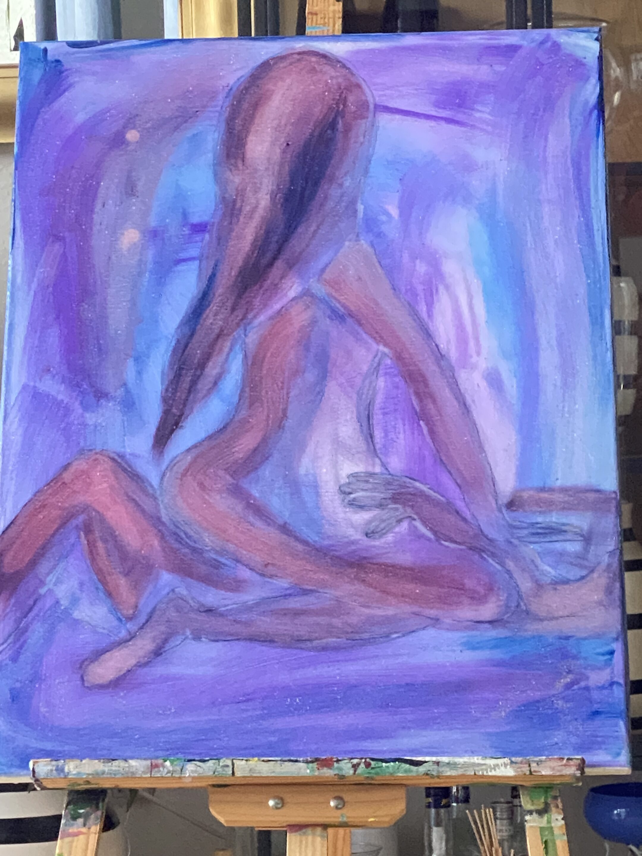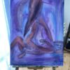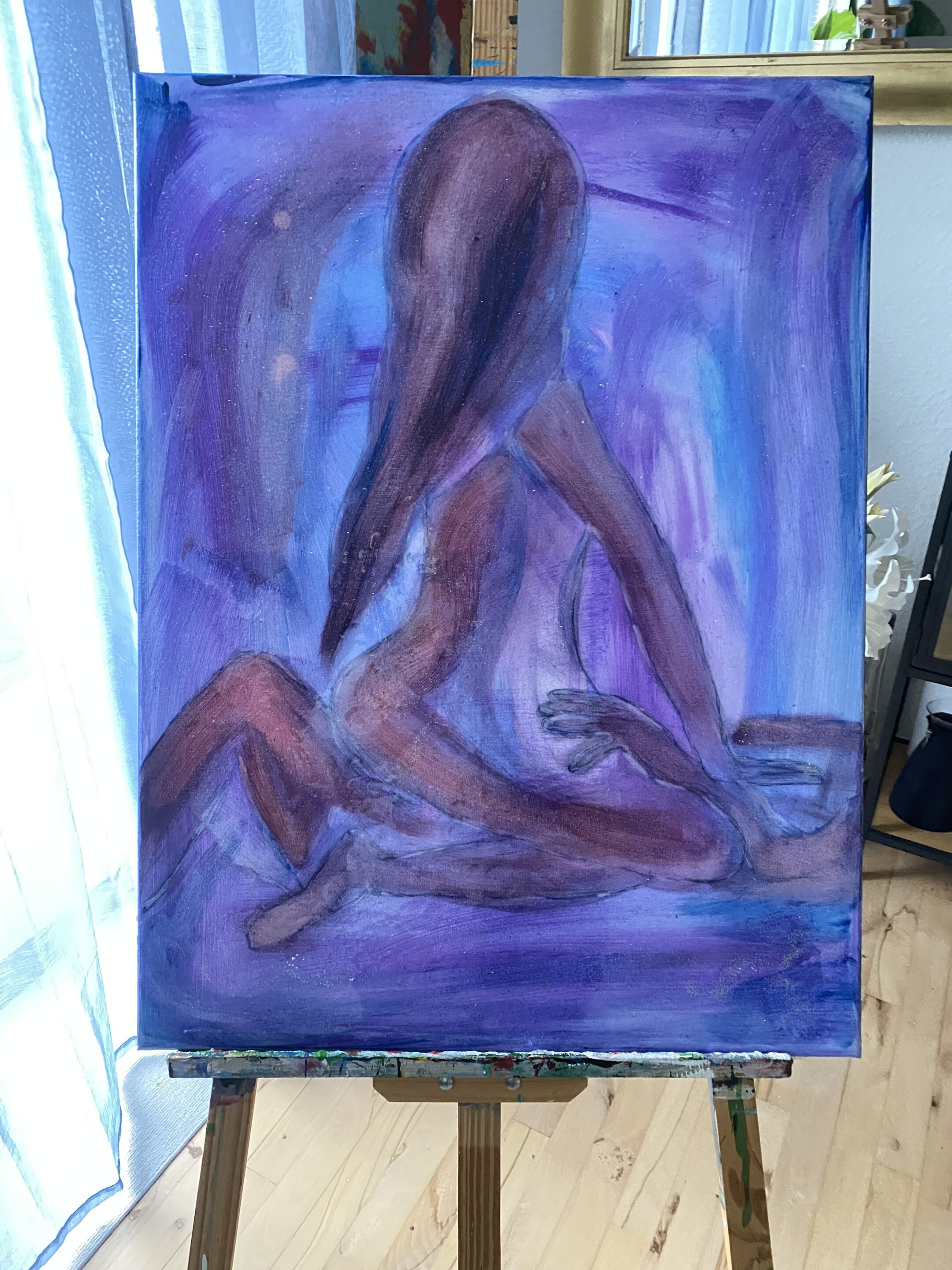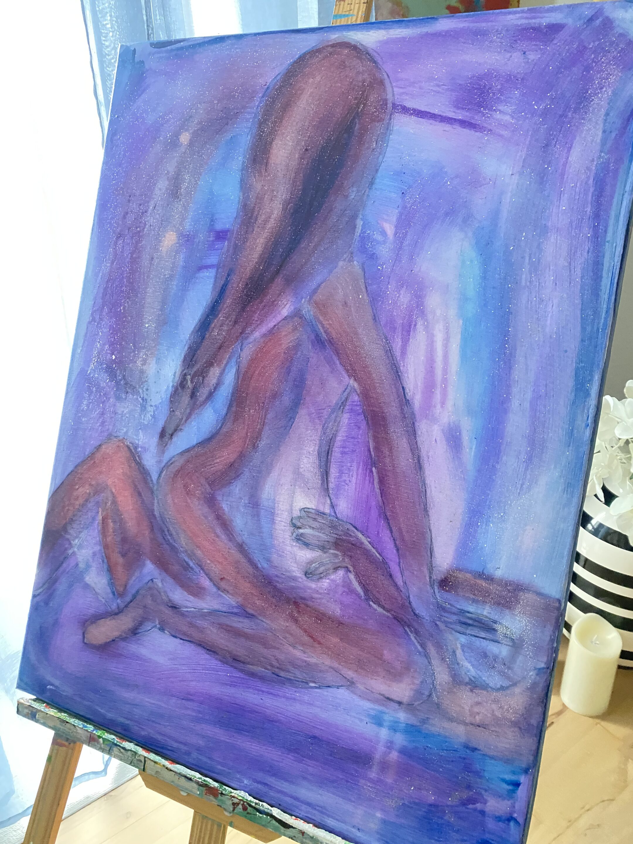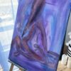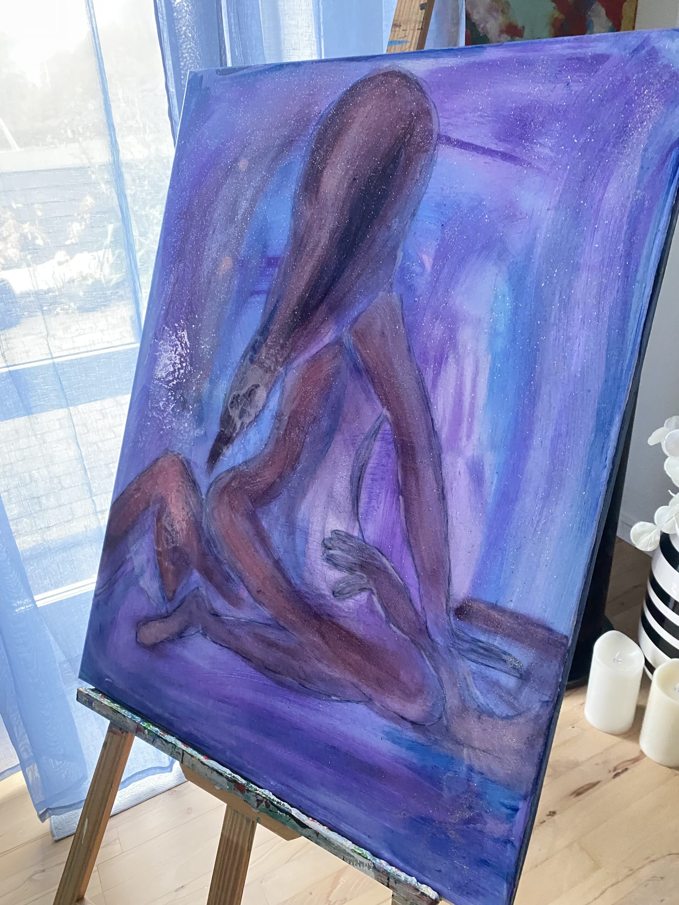 Et stemningsfuldt og sensuelt maleri i lilla og blå nuancer, hvor formerne flyder sammen i et intimt møde mellem to sjæle. Farverne smelter som energi og bevægelse, og værket udstråler varme, nærhed og forbindelse.