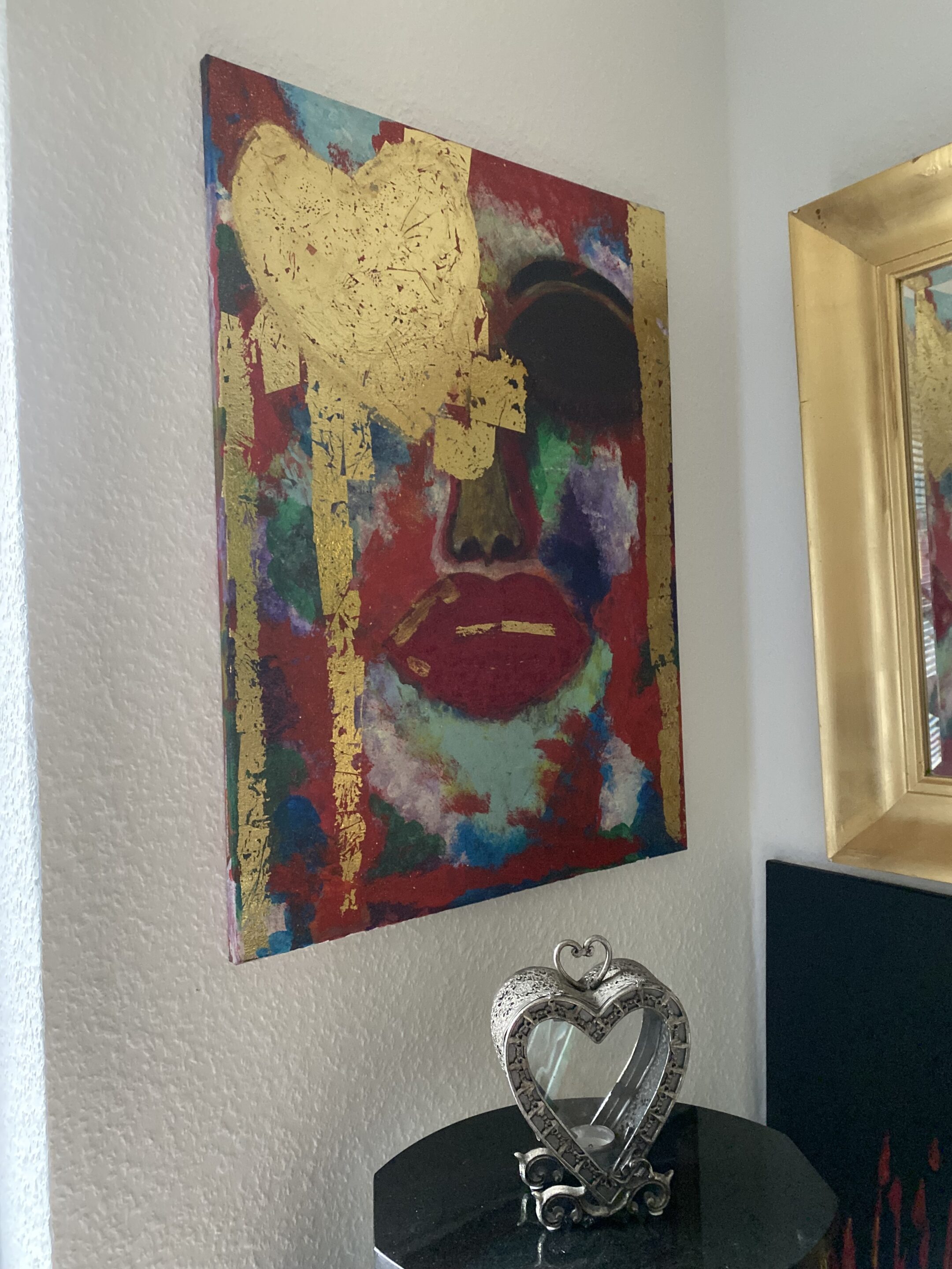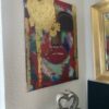 Dette abstrakte maleri viser et farverigt ansigt med fremtrædende røde læber og guld detaljer. Maleriet er lavet på lærred og har en vertikal rektangulær form. Det kan bruges som vægdekoration i bolig- eller kontormiljøer for at tilføre farve og kunstnerisk udtryk. 80×60 cm