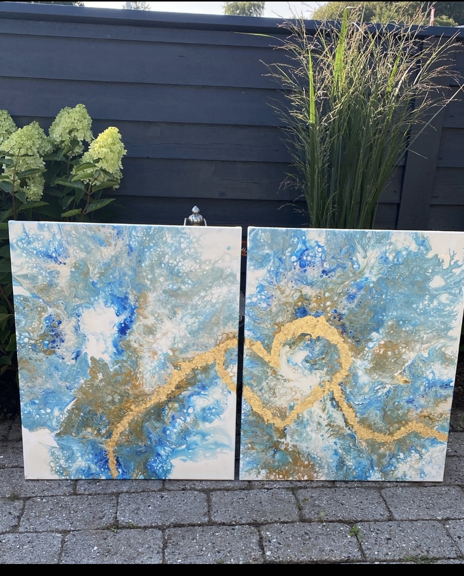 “Heartbeat “ 🩵er et moderne og stemningsfuldt maleri i to dele, hvor blå og hvide nuancer flyder sammen som vand og himmel, gennemskåret af en gylden puls – et symbol på liv, kærlighed og forbindelse.