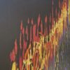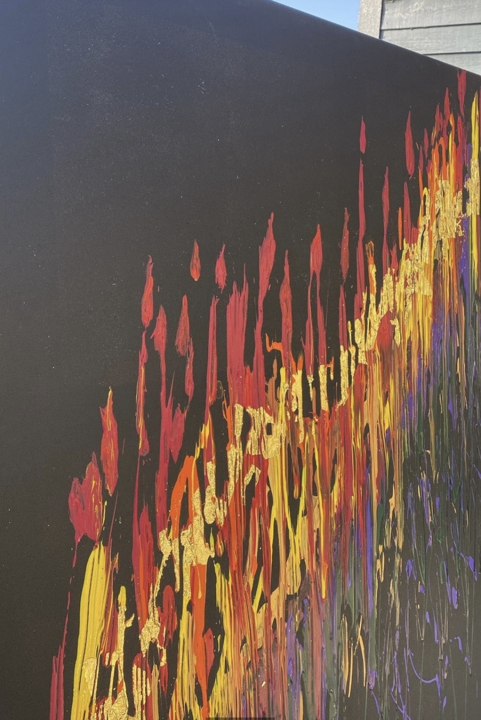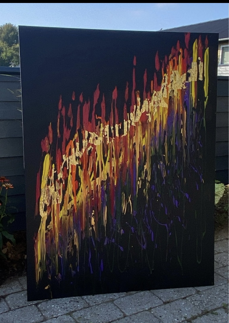 Et kraftfuldt og levende maleri, hvor farverne nærmest bevæger sig i flammer mod den mørke baggrund. De varme toner af rød, orange, gul og guld smelter sammen og skaber en følelse af energi, passion og bevægelse. Penselstrøgene og de dryppende linjer giver værket dybde og dynamik – som et udbrud af liv og lys i mørket.