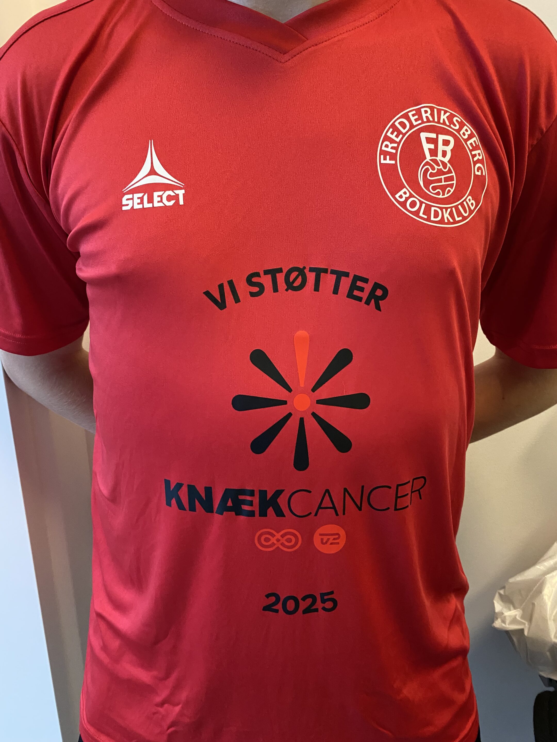 Den særlige FB- / Knæk Cancer-trøje sælges her som såkaldte ’Match Worn’-trøjer fra opgøret mod Vigerslev Boldklub, og indtægterne går ubeskåret til Knæk Cancer. Sidste år sendte vi lidt over 6.000 kroner afsted.