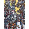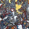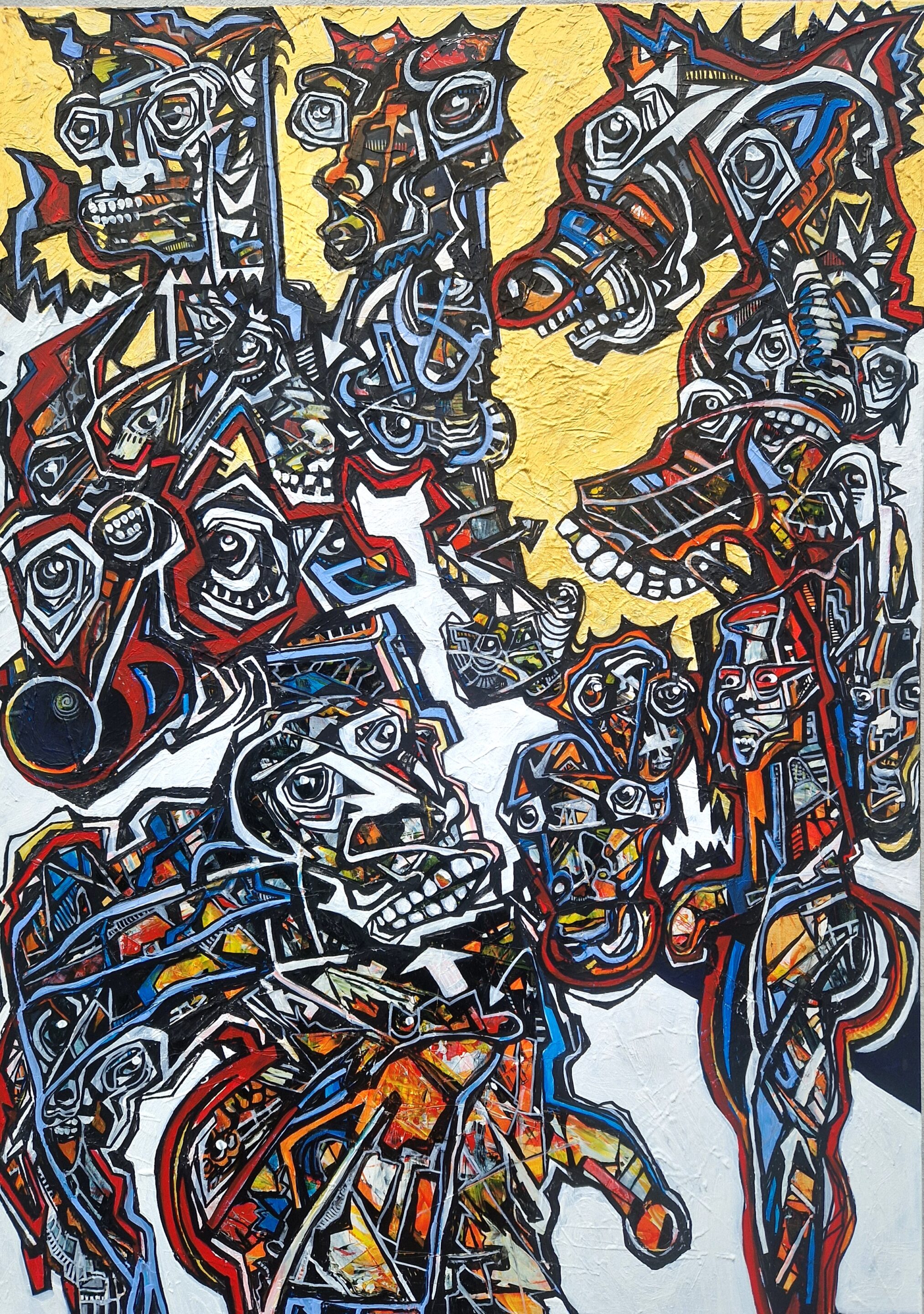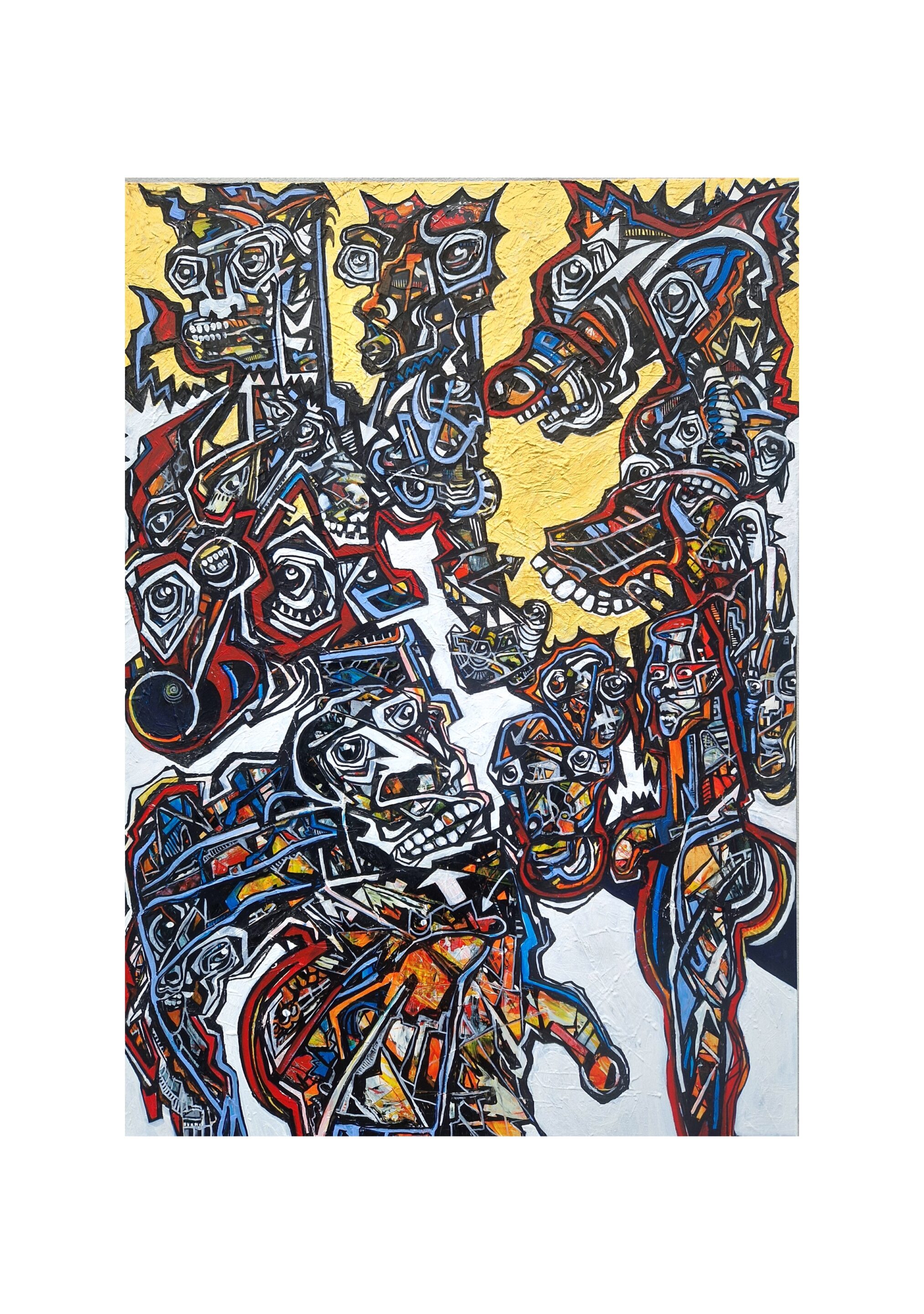 Til venstre i billedet ses en maskulin figur med et oksehoved, ovenover det, vokser farverige hoveder frem. Til højre i billedet ses en anden slank, maskulin figur. Dette maleri er